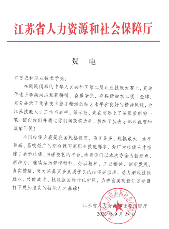9月23日,江苏省人力资源和社会保障厅发来贺电,祝贺伟德官网李康同学在中华人民共和国第二届职业技能大赛精细木工项目中取得金牌,向获奖选手、教练团队表示热烈的祝贺和诚挚的问候!