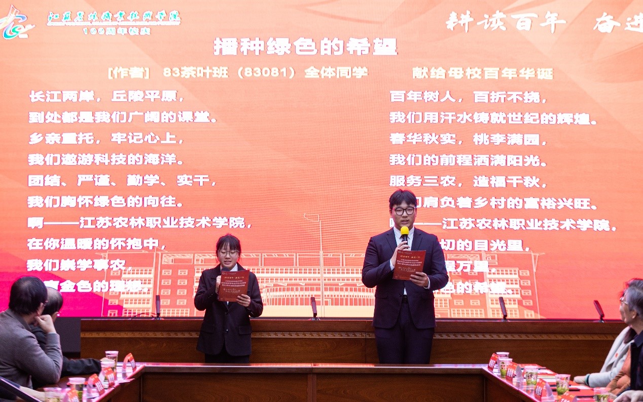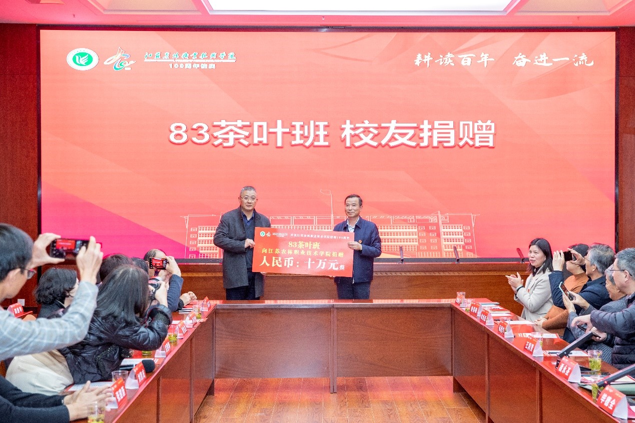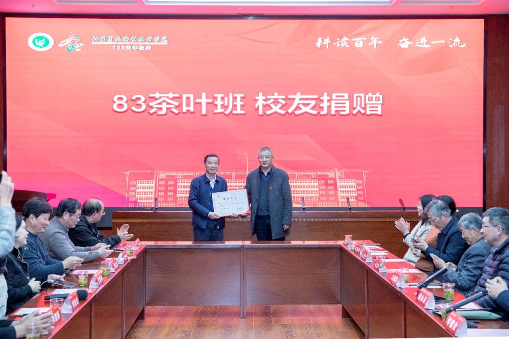 会上,83茶叶班校友感恩母校,关注母校发展,向母校捐赠资金10万元,曹正代表学院接受校友捐赠,并向校友颁发捐赠证书。现场在校生代表朗诵了83茶叶班校友丰成银为母校和同窗创作的诗歌《播种绿色的希望》《四十春秋一杯茶——致我们的“83茶”》。