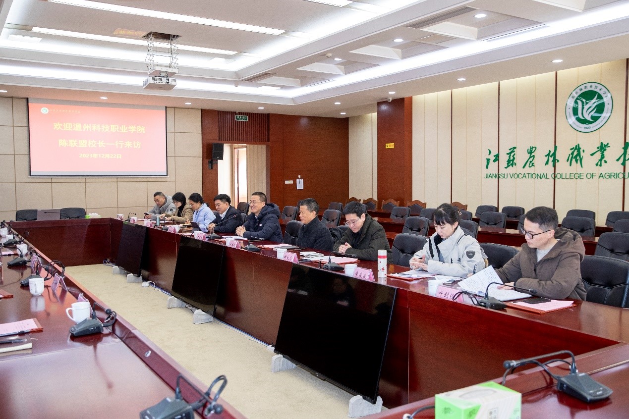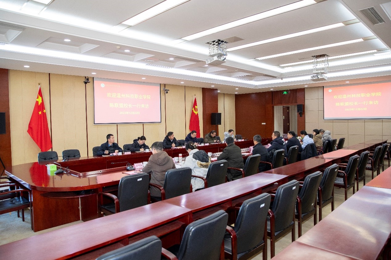 12月22日,温州科技职业学院院长陈联盟,副院长叶曙光、夏彩国等一行9人访问伟德官网。学院党委副书记、院长潘永圣及组织人事处、发展规划处、科技开发处等相关部门负责同志参与座谈。