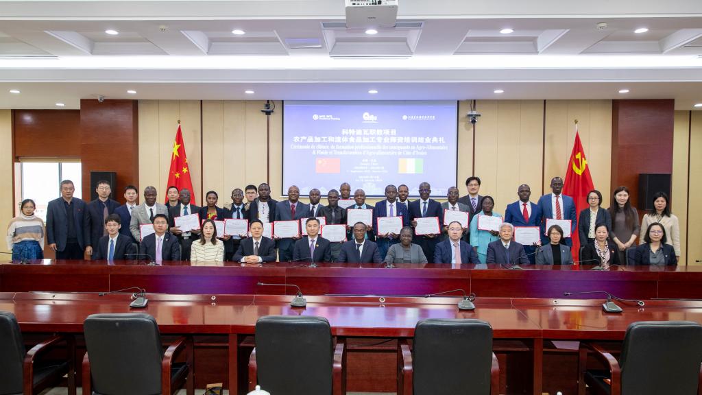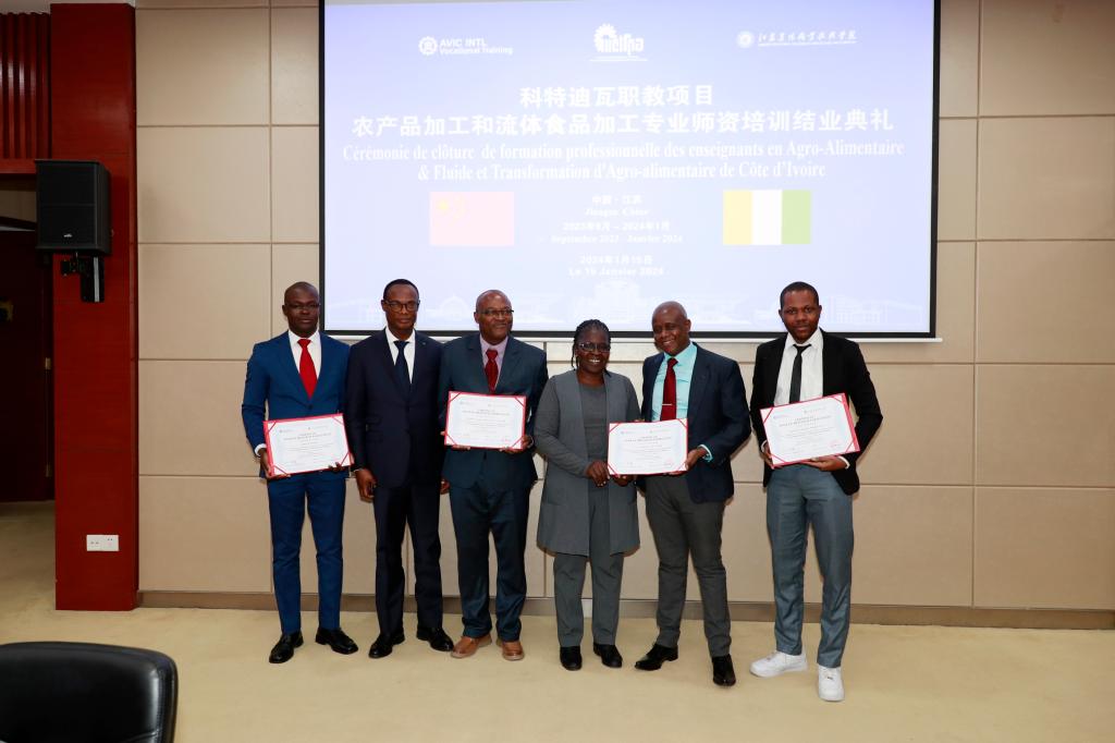 1月15日下午,科特迪瓦职业教育部部长办公室事务长、部长顾问与中航国际成套设备有限公司等一行来访伟德官网交流,并参加了科特迪瓦职教项目农产品加工和流体食品加工专业培训结业典礼。科特迪瓦职业教育部部长办公室事务长库亚迪奥·尼·布阿杜·达·卡迪亚图,部长顾问福菲·科菲,江苏省教育国际交流协会副会长马幸年,中国教育国际交流协会职业教育与培训部主任何培,中航国际成套设备有限公司副总经理许飞,江苏省农业农村厅相关负责同志,学院党委副书记、院长潘永圣及相关部门等负责同志、参训学员出席本次活动。结业典礼由BV伟德官方网站党委委员、副院长王瑾主持。