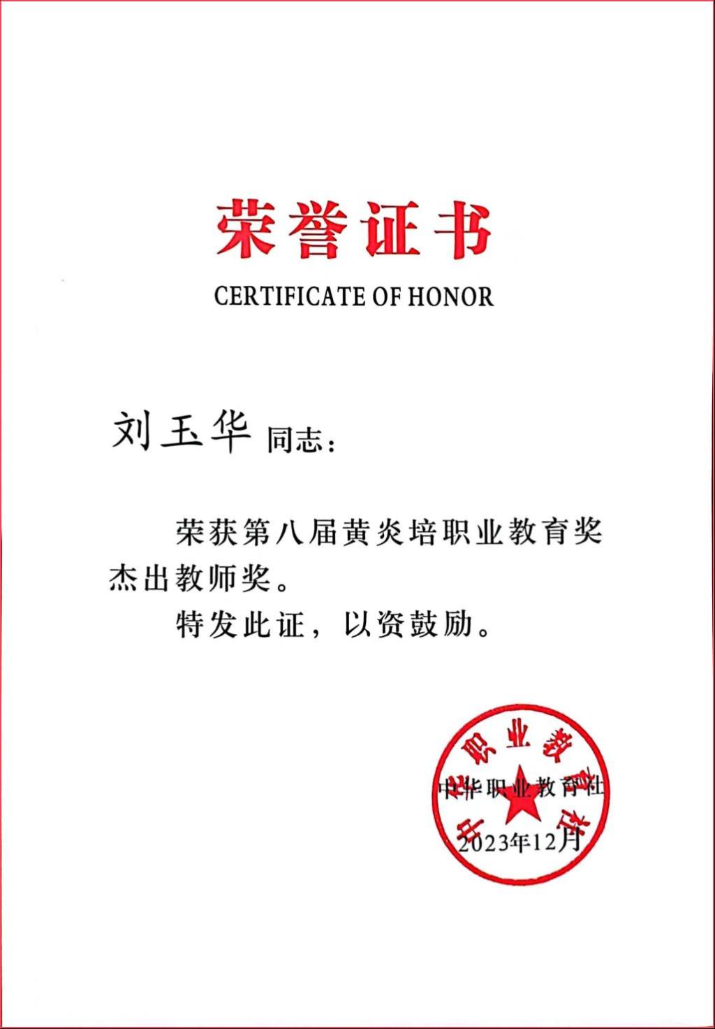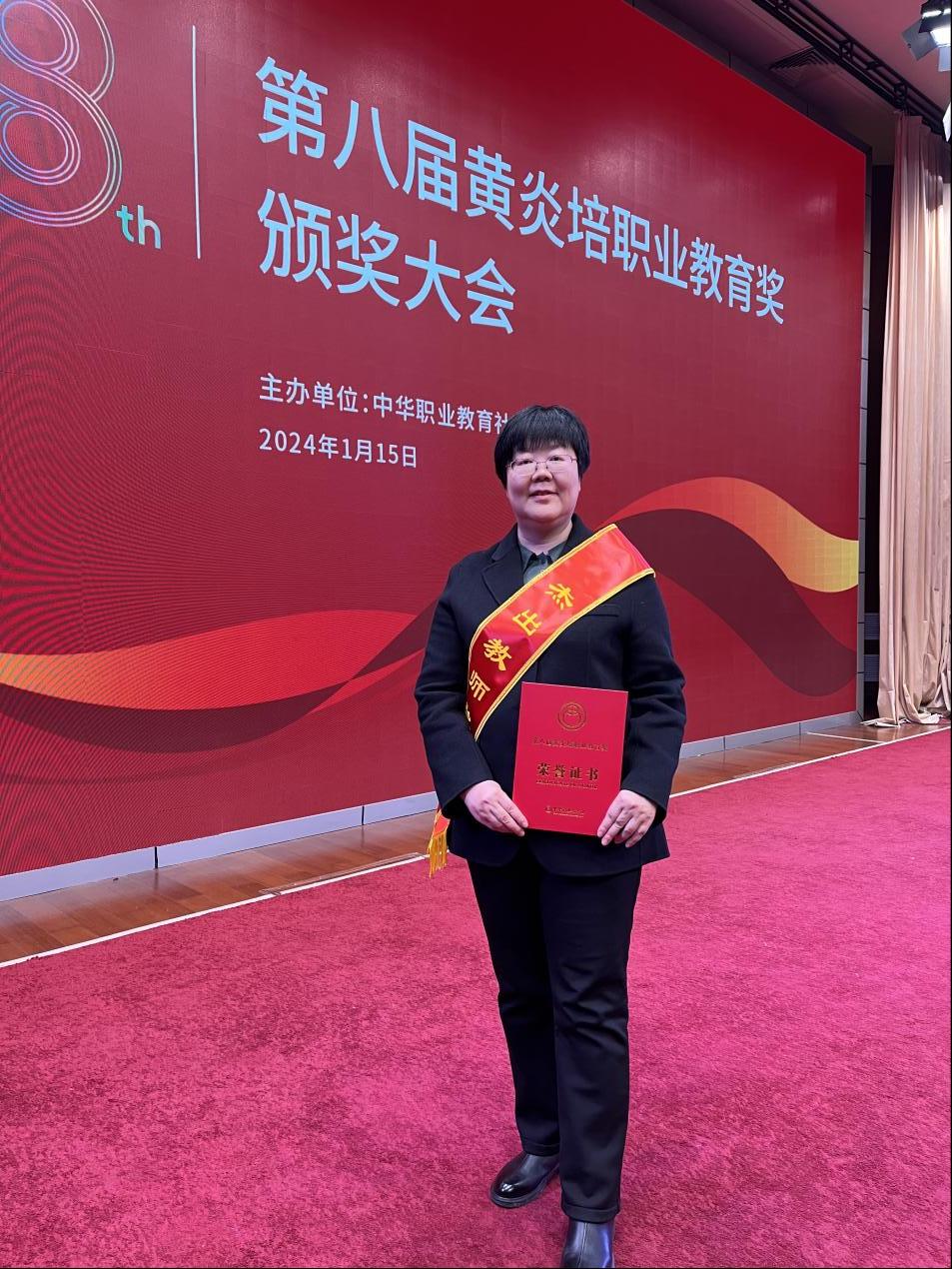 2023年12月25日,中华职业教育社公布了第八届黄炎培职业教育奖获奖名单,本届黄炎培职业教育奖共设立优秀学校奖50个,杰出校长奖50名,杰出教师奖100名,杰出贡献奖8个。伟德官网刘玉华教授荣获杰出教师奖,她也成为镇江市唯一一位获此殊荣的教师。
