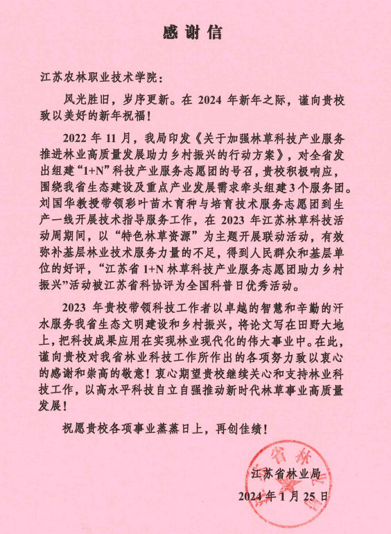 近日,江苏省林业局为伟德官网发来感谢信,对伟德官网彩叶苗木育种与培育技术服务志愿团在2023年“江苏省l+N林草科技产业服务志愿团助力乡村振兴”活动中做出的贡献给予高度肯定。