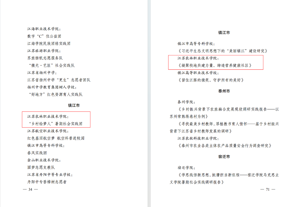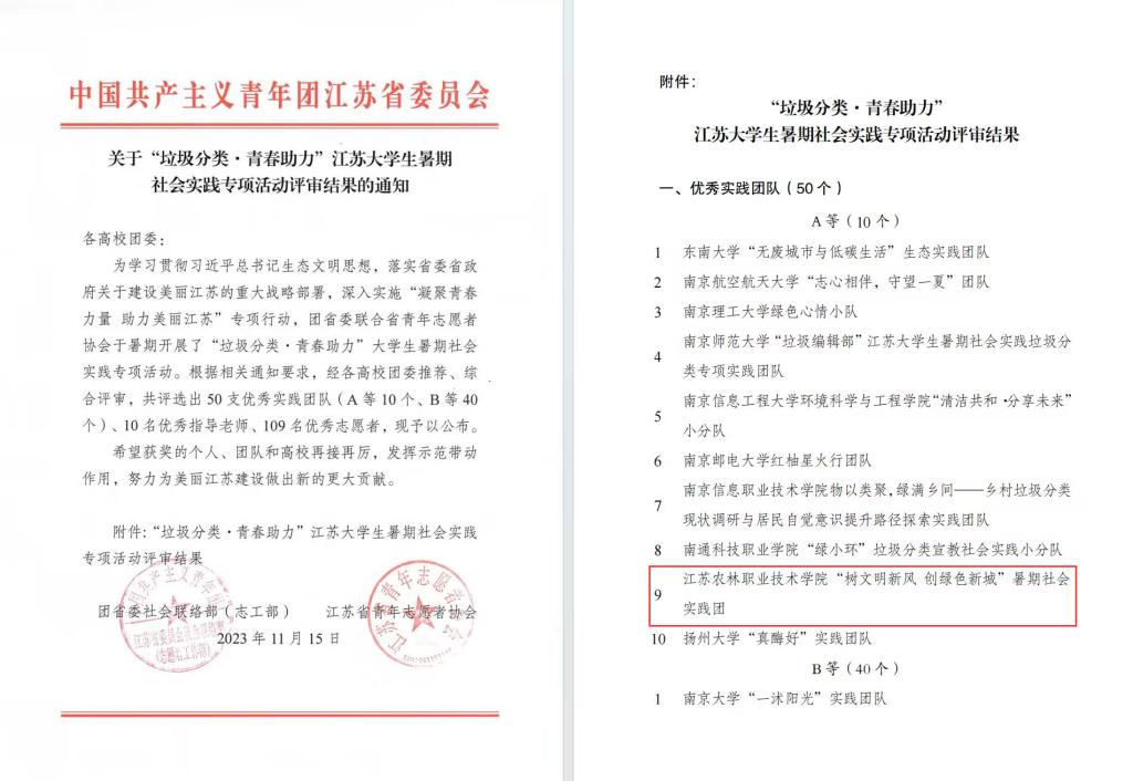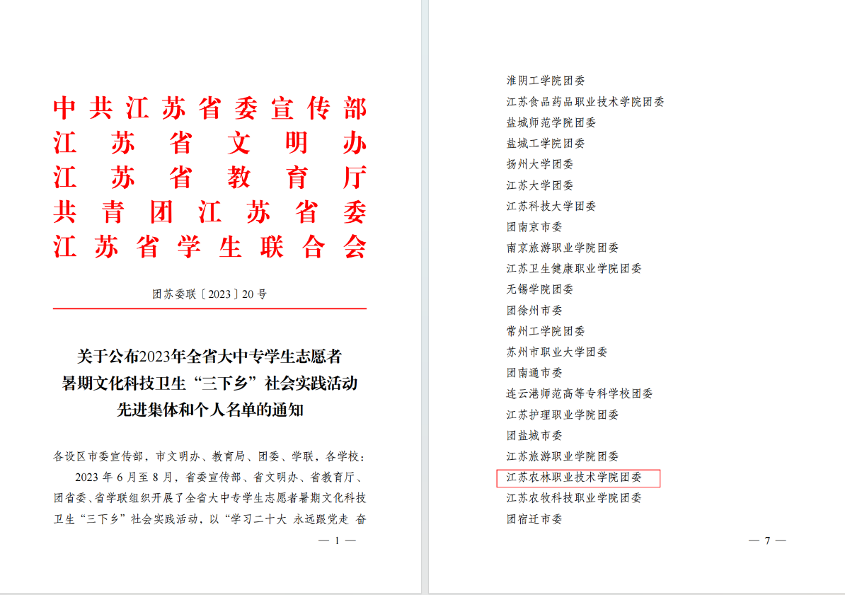 近日,团中央和团省委发布了《关于2023年全国大中专学生志愿者暑期文化科技卫生“三下乡”社会实践活动总结通报结果》《关于公布2023年全省大中专学生志愿者暑期文化科技卫生“三下乡”社会实践活动先进集体和个人名单的通知》和《关于“垃圾分类·青春助力”江苏大学生暑期社会实践专项活动评审结果的通知》,伟德官网大学生社会实践受到多项表彰,团委获评全省社会实践活动先进单位,袁敏敏同志获评全国社会实践活动优秀个人。“乡村绘梦人”团队获评全省社会实践活动优秀团队,《凝聚校地共建力量,缔造营养健康社区》获评全省社会实践活动优秀调研报告。在“垃圾分类·青春助力”江苏大学生暑期社会实践专项活动中,“树文明新风 创绿色新城”暑期社会实践获评优秀实践团队A等,全省共10支团队。