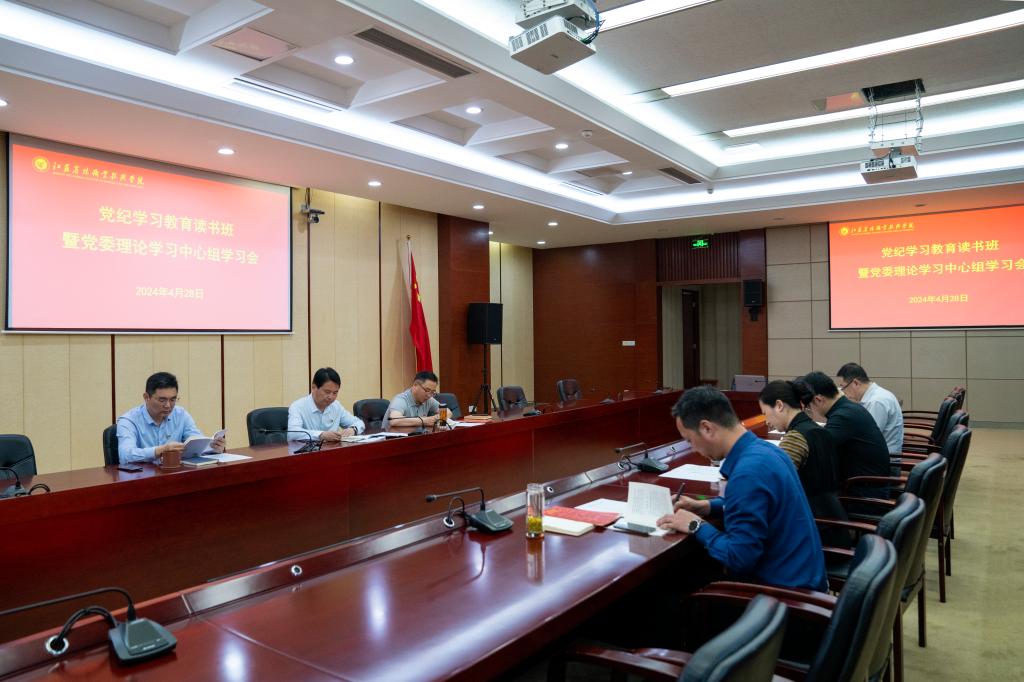 4月28日下午,学院举办党纪学习教育专题读书班暨党委理论学习中心组学习会,党委书记简祖平主持会议并做重点发言,党委副书记、院长潘永圣等进行了领学。
