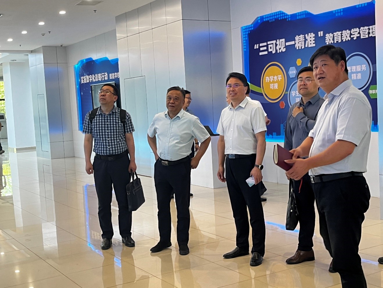 在湖南汽车工程职业学院,党委书记邓志革介绍了学院办学情况,双方围绕教师信息化素养培训、数字化新基建、数字化教学资源建设等方面进行了深入交流。简祖平一行参观了“智慧+”教育教学平台、智能制造公共实训中心等智慧教育场景。