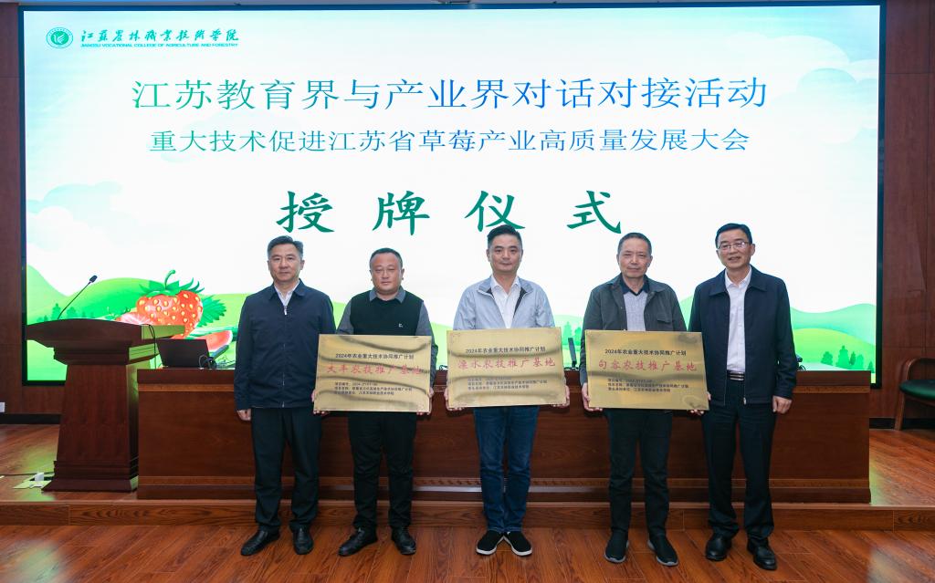 会上为2024年江苏省草莓省力化高效生产技术协同推广计划“农技推广基地”授牌,学院与南京美莓源生态农业科技有限公司、盐城市金沃源农业发展有限公司签订合作协议。