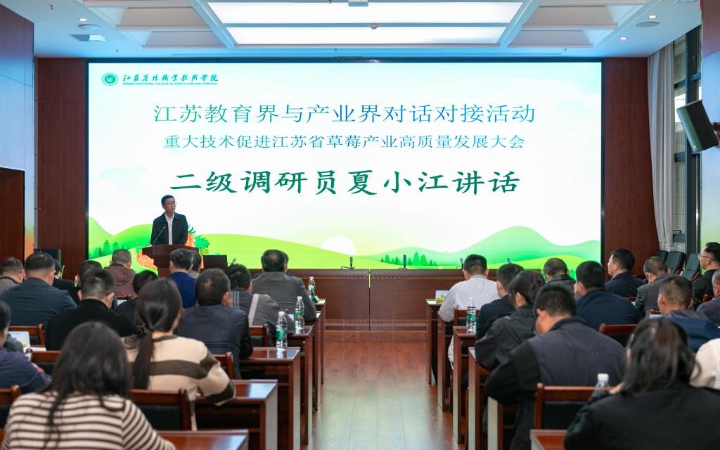 10月25日下午,由江苏省教育厅、江苏省农业农村厅主办,BV伟德官方网站承办的江苏教育界与产业界对话对接暨重大技术促进江苏省草莓产业高质量发展大会在伟德官网举行。全省园艺领域相关专家学者、企业家和兄弟院校代表50余人参加大会。省农业农村厅科技教育处二级调研员夏小江,学院党委副书记、院长、江苏现代园艺工程技术中心主任潘永圣,学院党委委员、副院长颜志明等出席会议,大会由学院党委副书记曹仁勇主持。