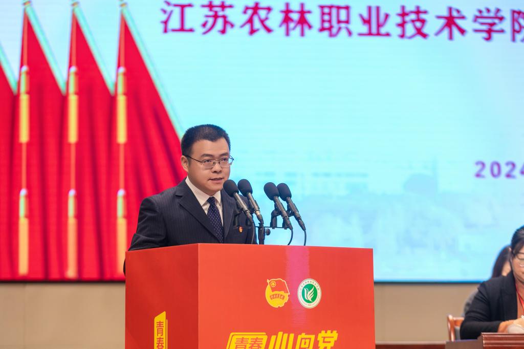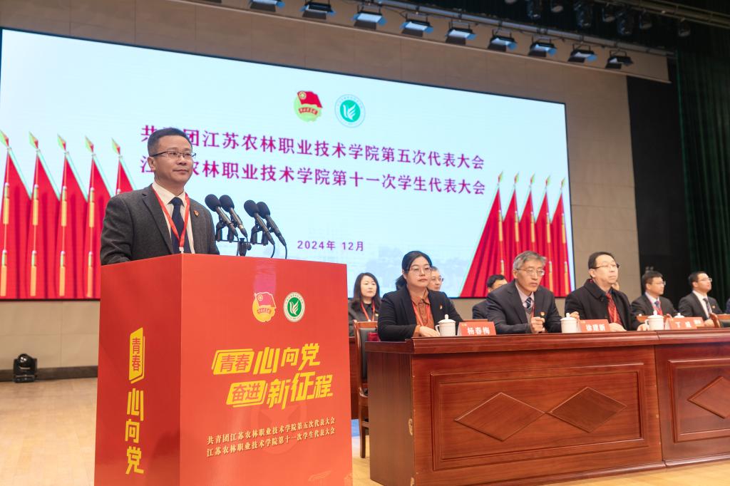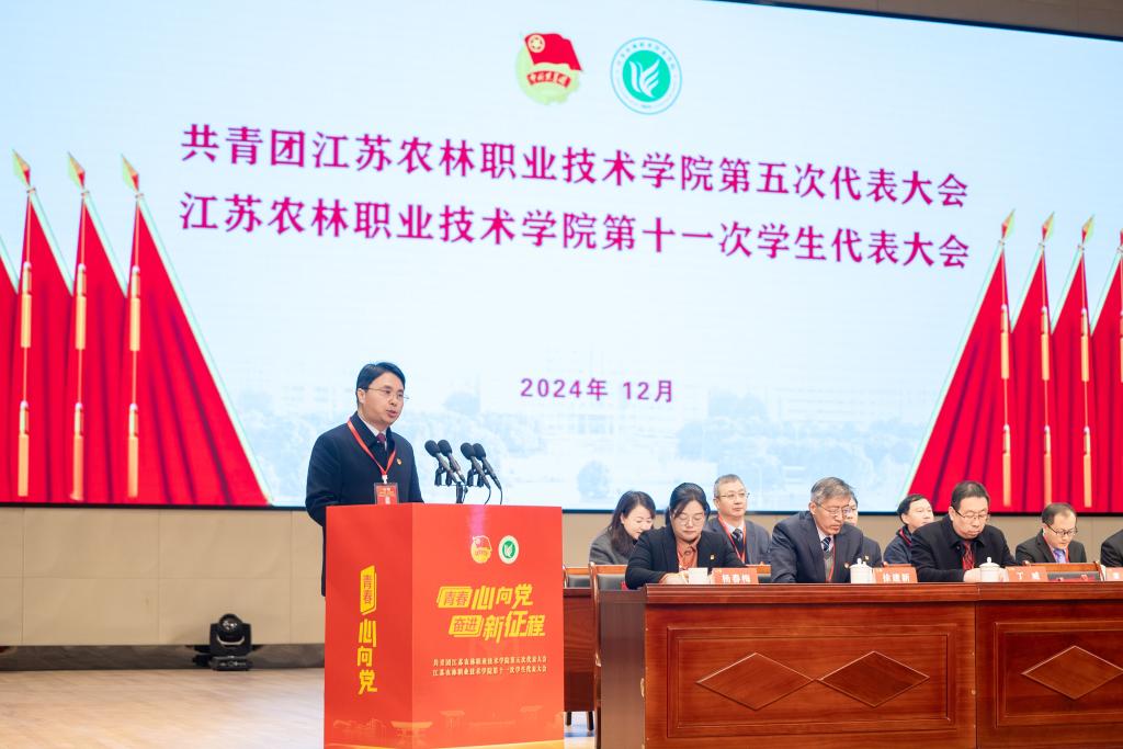 张海洋、学院妇联主席杨春梅同志分别代表兄弟院校和群团组织致贺词,镇江市学生联合会驻会执行主席、江苏大学刘英胜同学代表上级学联致辞。南京农业大学、中南财经政法大学、上海海洋大学、江南大学、南京师范大学、东北农业大学、北京工业大学、南京林业大学、江苏大学、扬州大学等来自全国27个省、自治区、直辖市的56所兄弟院校团委,江苏省农业农村厅团委、句容团市委向大会发来贺信贺电。