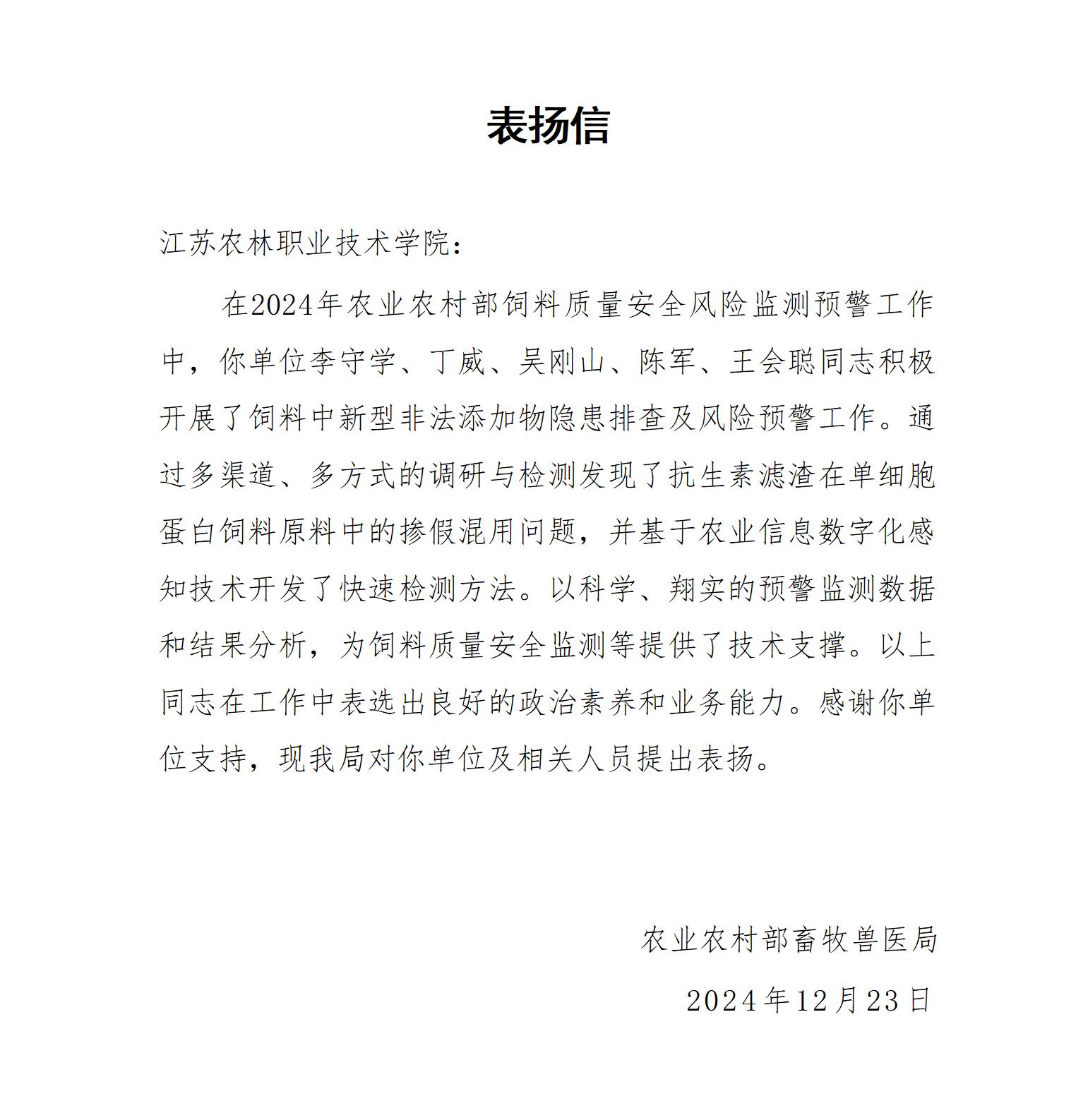 12月13日,2024年农业农村部饲料质量安全风险预警工作年终总结会暨2025年饲料质量安全风险预警工作部署会在武汉举办。伟德官网李守学、丁威、吴刚山、陈军、王会聪高质量完成了饲料中新型非法添加物隐患排查及风险预警工作,以科学、翔实的预警监测数据和结果分析,为饲料质量安全监测等提供了技术支撑。农业农村部畜牧兽医局对伟德官网以上人员提出表扬。