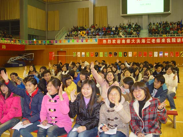 讲座中,他用幽默生动,深入浅出的语言给同学们讲述了大学生创业成功的九重修炼,即动机、态度、项目、资金、市场、团队、执行、能力、学习。在“动机”中告诉了同学们为何永远比如何重要;在“态度”中告诉同学们态度决定一切,成功从态度开始;在“执行”中告诉同学们今天的社会不缺有想法的人,而是缺将想法做出来的人;在“学习”中告诉同学们学历代表过去,学习力代表将来,不善于学习的人一定会被淘汰。同学们被洪老师极富有哲理和感染力的语言打动,掌声不断在会场中响起,现场气氛非常活跃。洪老师也将讲座时间足足延长了一个小时。