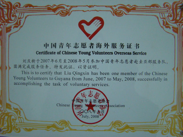 2007年6月,伟德官网刘庆新同志作为中国江苏首批赴圭亚那青年志愿者之一,远赴圭亚那开展志愿者服务活动。过去的一年里,远离祖国和亲人,克服语言、文化、环境等各种困难,深入城市、乡村和各级机构,在教学等领域大力开展志愿者服务,用劳动、智慧和汗水谱写了一曲动人的志愿者之歌。 目前,刘庆新同志被共青团江苏省委评为“江苏省新长征突击手”。学院团委号召全院广大师生团员学习团结友爱、助人为乐、甘于奉献的志愿者精神,各系团组织要积极开展志愿者服务活动,进一步学习社会主义荣辱观,大力弘扬志愿者服务精神。
