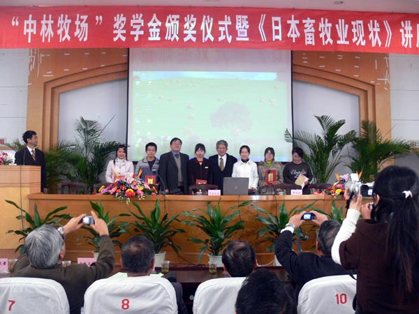 2007年11月26日,畜牧兽医系“中林牧场奖学金”颁奖仪式在综合楼九楼会议室隆重举行。尹汉学院长出席仪式并对中林正悦先生一行表示热烈欢迎,对中林正悦先生长期致力于畜牧业发展所做的贡献给予了高度评价。尹汉学院长及中林正悦先生亲自为获奖同学颁发证书和奖金。获奖代表邵娟同学发言,对中林正悦先生表达了诚挚的感谢。最后森川茂幸先生做报告——《日本畜牧业现状》,详细介绍了日本畜牧业的发展现状,使我系学生对国外畜牧业现状有了一定的了解,开阔了视野。