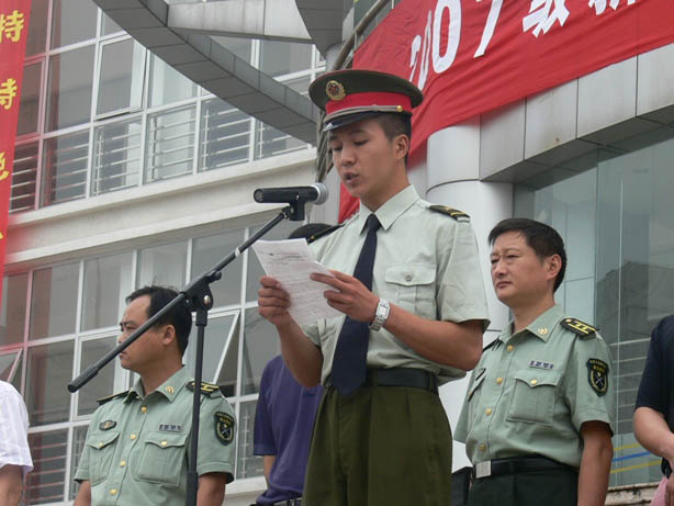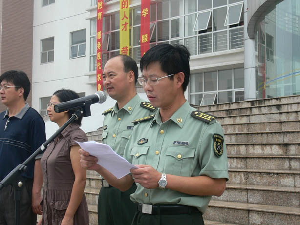 9月18日上午8:30,伟德官网句容校区2007级新生开学典礼暨军训动员大会在北校区图书楼前冒雨举行,学院尹汉学院长、李振陆副院长、王润贤副书记,句容市人武部政工科尤红光、承训部队73667王小林副司令、军训团团长余国良等到会并发言,王润贤副书记主持大会。
