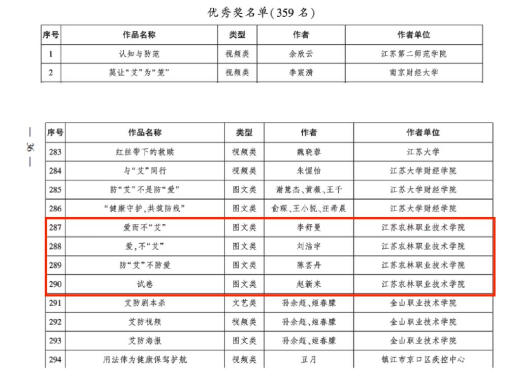 近日,由江苏省教育厅、江苏省卫生健康委员会联合主办的江苏省第二届艾滋病等传染病防治教育作品征集活动评选结果揭晓,活动共评选出一等奖30个,二等奖70个,三等奖100个,优秀奖359个。茅山校区报送的5件作品入围获奖。