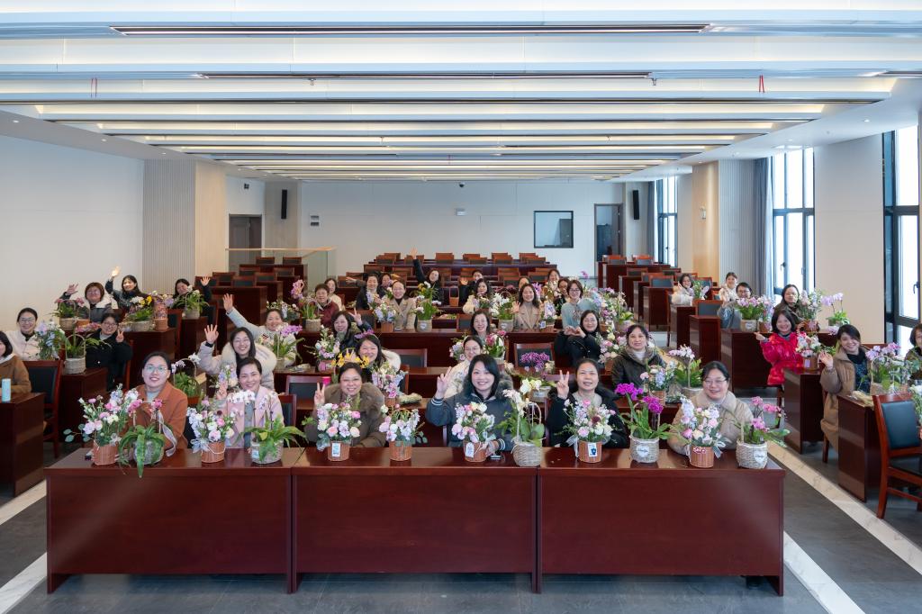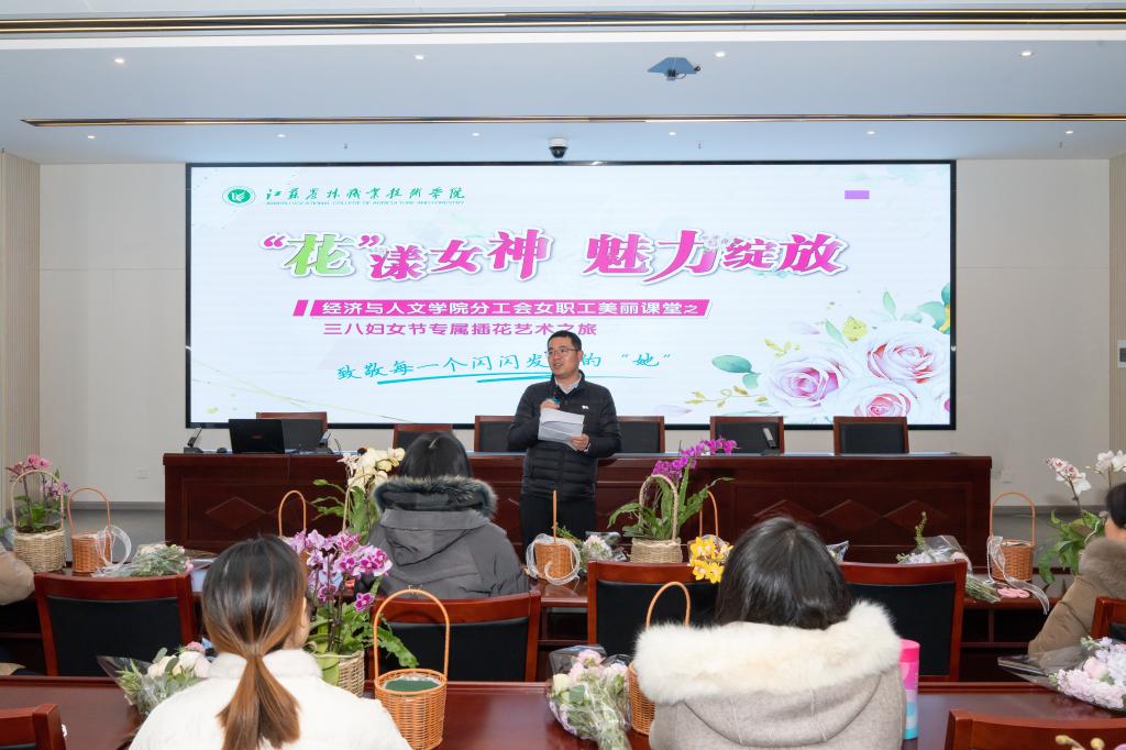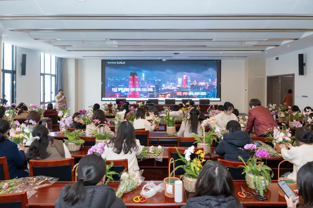 在三八国际妇女节来临之际,3月5日,经济与人文学院分工会在学院乡村振兴学院会议室组织了“‘花’漾女神,魅力绽放——女职工美丽课堂之三八妇女节专属插花艺术之旅”主题团建活动。学院工会主席陈兵、妇联主席杨春梅,学院女职委委员、经济与人文学院分工会女职工等50余人齐聚一堂,共享这一充满诗意与温馨的时刻。活动由经济与人文学院分工会主席张媛主持。
