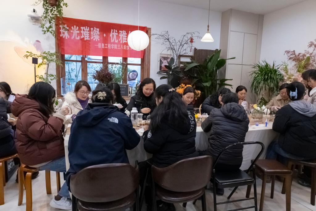 风传花信,雨濯春尘。在第115个“三八国际妇女节”来临之际,3月5日,信息工程学院分工会开展“珠光璀璨·优雅绽放”珍珠首饰DIY沙龙活动,分工会全体女教师参加了此次活动。