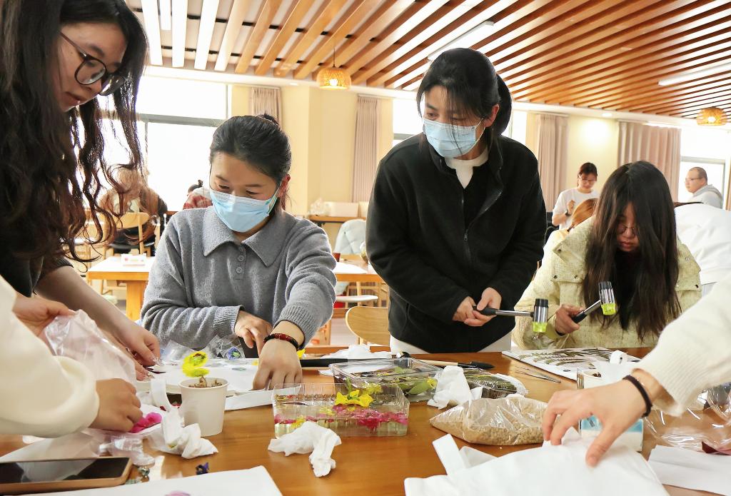 植物拓印以春日植物为媒,定格植物百态。校区新农人文创园拾春呓语蓝印花坊负责人现场示范植物选材、布局与敲击的技巧,指导老师们通过不同植物的组合创作独一无二的春日画卷。伴随着清脆的敲击声,紫荆的叶脉、樱花的柔瓣在帆布上渐次绽放,原本素净的帆布包瞬间焕发生机。老师们纷纷表示,这是一场与自然对话的治愈之旅,亲手制作的帆布包是承载春日记忆的珍贵礼物。