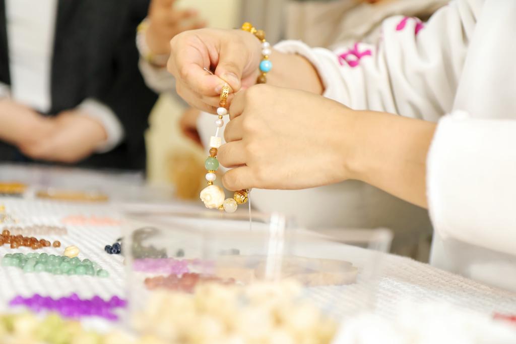 手工串珠区珠玉璀璨夺目,老师们挑选搭配,根据个人审美设计饰品,通过色彩碰撞、珠串组合,制作出风格各异的手链、项链。现场珠光熠熠,欢声连连,教职工于协作交流中深化情谊,女性之细腻匠心尽显无遗。