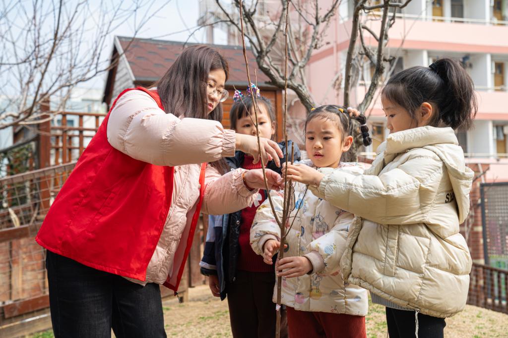 在文昌幼儿园的种植区,大学生志愿者们与小朋友们组队,开启了植树挑战。志愿者们握着小朋友的手,一起扶正树苗、挥锹培土、提水浇灌。每棵树都挂上树牌,上面写着小朋友的班级、植树日期和树的品种。