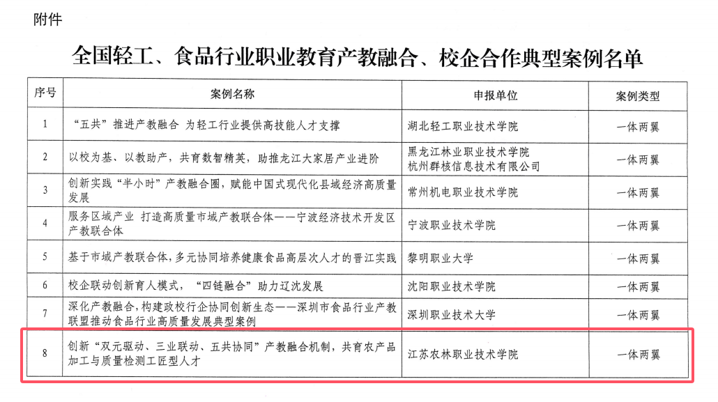 4月7日,中国轻工业联合会发布《全国轻工、食品行业职业教育产教融合、校企合作典型案例(2023-2024年度)》,伟德官网《创新“双元驱动、三业联动、五共协同”产教融合机制,共育农产品加工与质量检测工匠型人才》作为典型案例成功入选。