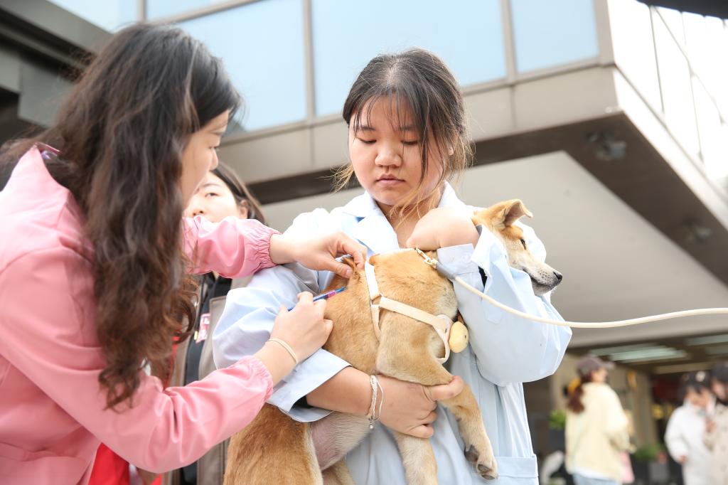 活动现场,经过健康筛查的流浪犬在“政-校-企”三方护航下,开启融入家庭的新旅程,为城市文明养犬治理注入专业力量与人文关怀。以畜牧兽医学院学生志愿者为活动主力,联合“校企合作”宠物医院,共同为待领养犬只完成基础体检、疫苗接种等全流程健康保障。参与本次活动的同学表示:“亲手为流浪犬注射疫苗、记录体征,既是课堂知识的实战检验,更让我们体会到‘生命守护者’的责任。”