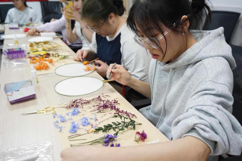 活动邀请夫子庙街道文化站干事何振讲解压花工艺的发展历史,通过展示传统工具与经典扇面作品,解析其文化内涵与艺术价值,并围绕“青年如何活化传统文化”展开互动研讨。在实践环节,同学们分组合作,学生将五四运动历史符号、青年奋斗等时代元素融入创作,完成10余件兼具古韵与新意的压花扇作品。