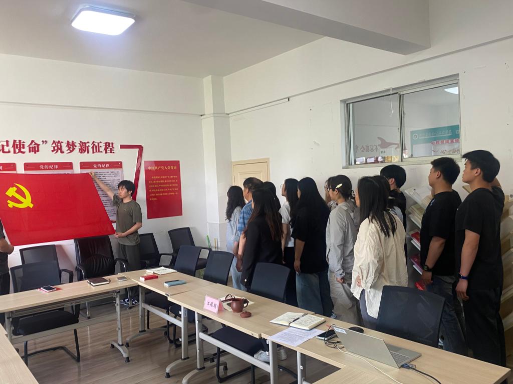 “我志愿加入中国共产党……”在党支部组织委员杨帆的领誓下,全体毕业生党员面向党旗庄严宣誓,铿锵誓言回荡会场,初心使命再次升华。随后,支部为毕业生党员送上“特殊礼物”:一本党章、一枚党徽、一张寄语卡。寄语卡上书写了支部对学生党员“永葆赤子之心,勇担时代重任”的殷切嘱托。