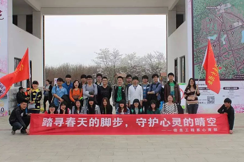 3月30日,信息工程系组织各班心育委员和学生代表,在天王浮山樱花园举办了“踏寻春天的脚步,守护心灵的晴空”户外心理健康教育活动。 此次活动主要依据现在比较流行的赏花疗法,带领学生走出去感受春天,通过置身于优美、芬芳、静谧的花木丛中,愉悦优化情绪,缓解紧张的神经,使同学们身心得以放松。活动期间,还举行了手语操《感恩的心》的学习和展示,并分组在赏花抚草的同时进行心情板创意留影等环节,引导同学们放下负面情绪,感受春天,释放闭锁的心灵。