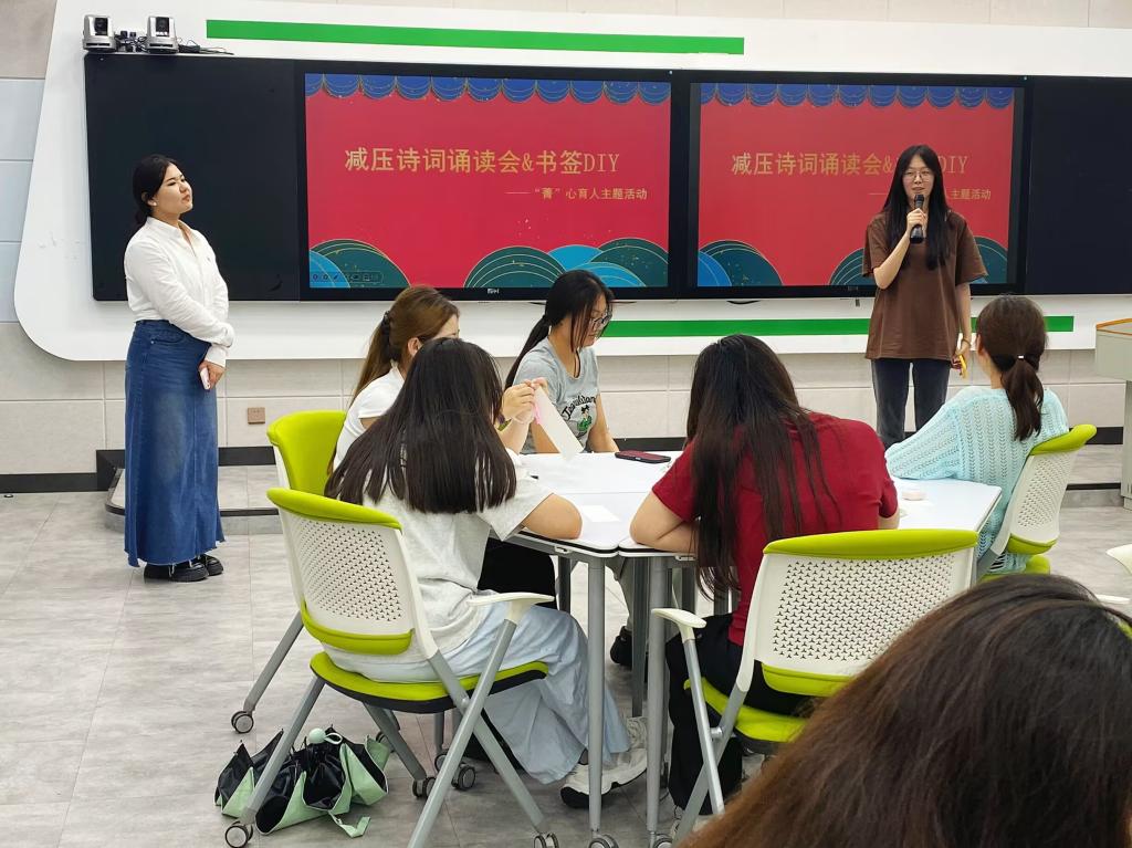 为缓解学生的心理压力,弘扬中华优秀传统文化,5月21日在工科楼B213,学院举办了“诗语润心,笺香疗愈”诗词诵读会暨书签制作心理主题活动。诗词诵读环节,学生们声情并茂地诵读一首首积极、乐观、进取主题诗词名句,分享自己对诗词的理解以及诗词对自己的启发和影响。书签制作环节,学生们充分发挥想象力与创造力,在动手实践与文化熏陶中,写下励志话语,传递进取力量。