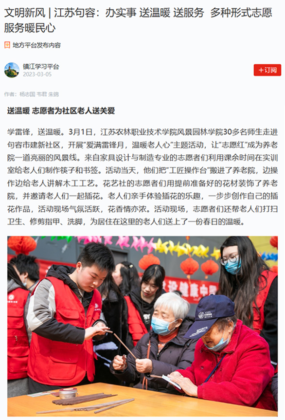 近年来,风景园林学院多次走进句容市各个社区,以实际行动参与到志愿活动中,孝亲敬老彰显新时代大学生的责任与担当。此次活动仅是雷锋活动月活动之一,风景园林学院还将开展“环保践行二十大,正‘植’青春‘雷锋’行”等学雷锋系列活动,用实际行动传承雷锋精神,用传统美德彰显社会责任。