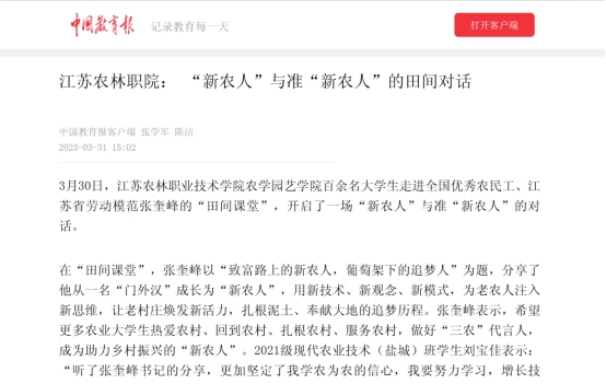 【中国教育报】3月30日,BV伟德官方网站农学园艺学院百余名大学生走进全国优秀农民工、江苏省劳动模范张奎峰的“田间课堂”,开启了一场“新农人”与准“新农人”的对话。
