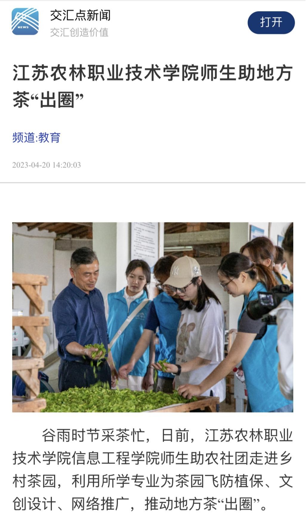 在句容行香绿润茶场,天之翼无人机社团的无人机上演了飞防植保“时尚秀”、盛世古德创意设计社团和田园影像社的队员通过走访茶农,体验采茶制茶,了解了地方茶历史和茶文化,知晓了民间谚语“谷雨谷雨,采茶对雨”的由来,并全程拍摄记录,从中获取灵感,在产品包装、品牌推广上创新思维,继承中华民族优秀茶文化的同时又力求结合时代背景,致力于让茶成为美学和品味的传递,成为潮流有范儿的事情。