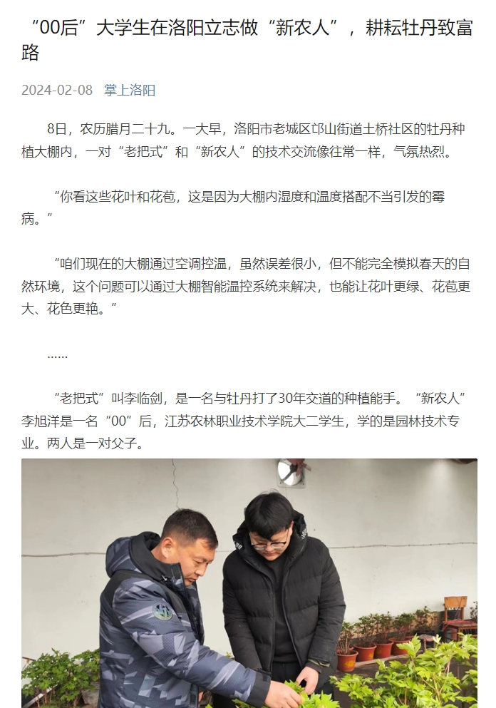 新闻链接:“00后”大学生在洛阳立志做“新农人”,耕耘牡丹致富路 (lyrbs.com)