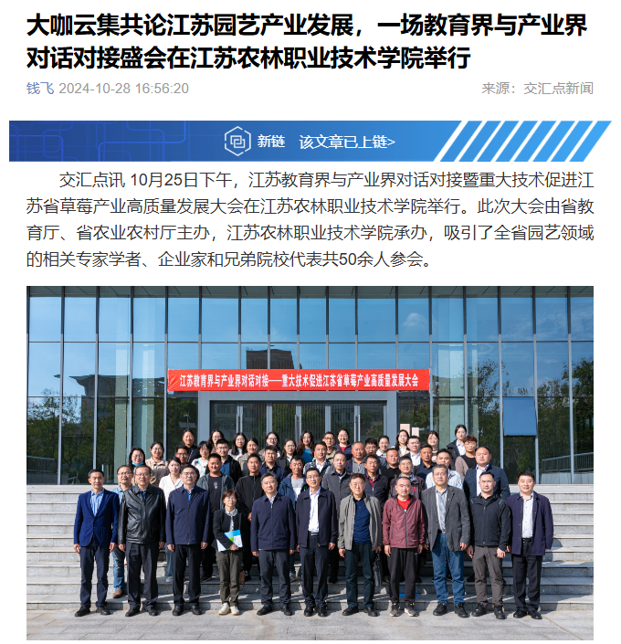 交汇点讯 10月25日下午,江苏教育界与产业界对话对接暨重大技术促进江苏省草莓产业高质量发展大会在BV伟德官方网站举行。此次大会由省教育厅、省农业农村厅主办,BV伟德官方网站承办,吸引了全省园艺领域的相关专家学者、企业家和兄弟院校代表共50余人参会。