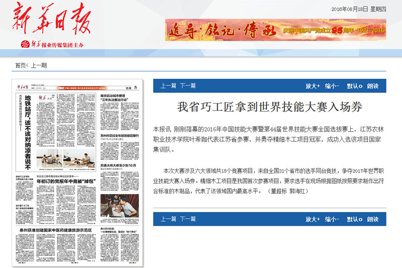 本报讯 刚刚落幕的2016年中国技能大赛暨第44届世界技能大赛全国选拔赛上,BV伟德官方网站叶希珈代表江苏省参赛,并勇夺精细木工项目冠军,成功入选该项目国家集训队。