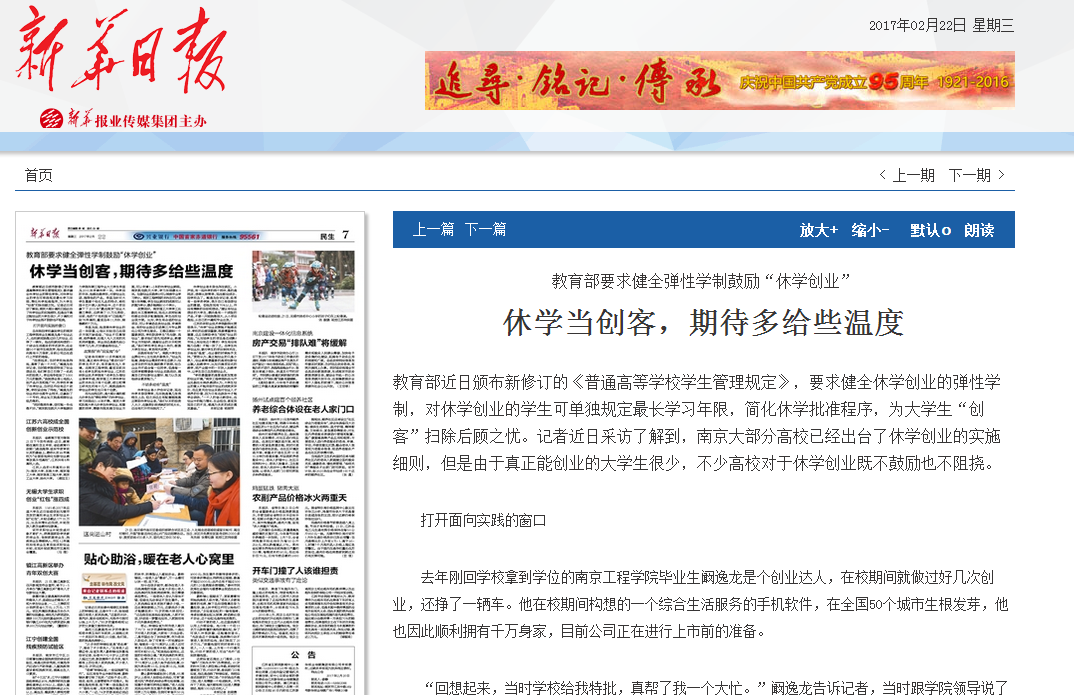 “回想起来,当时学校给我特批,真帮了我一个大忙。”阚逸龙告诉记者,当时跟学院领导说了创业想法后,他们帮自己引荐了一名杭州的投资人,幸运地争取到了5000万元的融资。“我就想全身心地投入到产品开发和推广中,向学校申请了休学创业,当时还并没有这个政策,学校设法给了特批。”阚逸龙的创业活动也跟专业相关,还拿到了一个专利,毕业论文就是根据创业经历做的。
