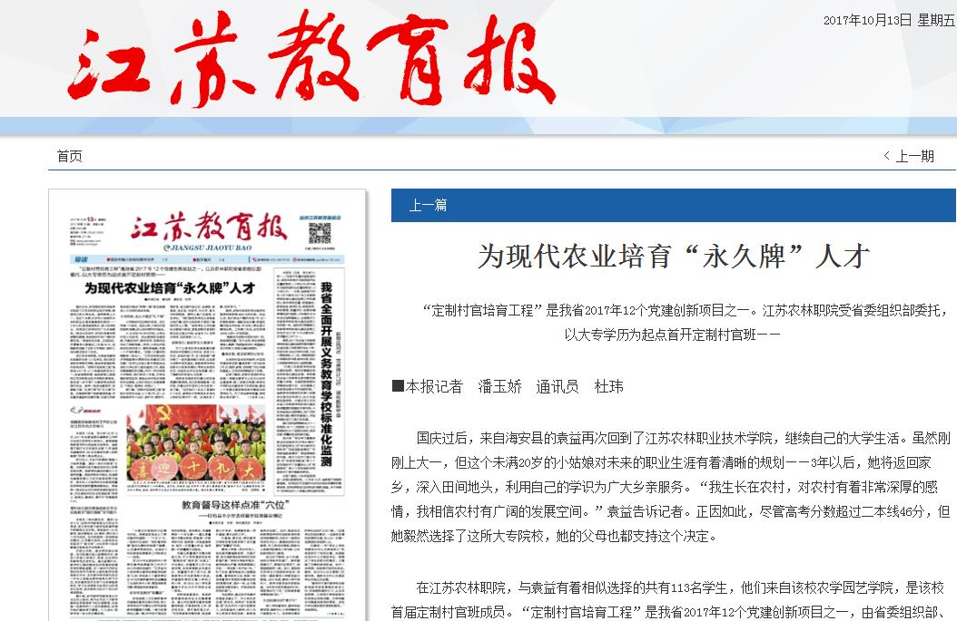 《江苏教育报》10月13日头版头条以《为现代农业培育“永久牌”人才》为标题,大篇幅报道伟德官网通过“定制村干培育工程”,为现代农业培育既能在一线从事现代农业生产,又具备村务管理能力和基层治理能力的新农村基层党政干部后备人才。