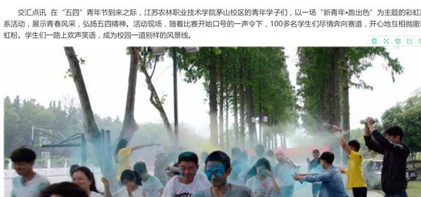 在“五四”青年节到来之际,茅山校区的青年学子们,以一场“新青年•跑出色”为主题的的彩虹跑活动展示青春风采,弘扬五四精神。