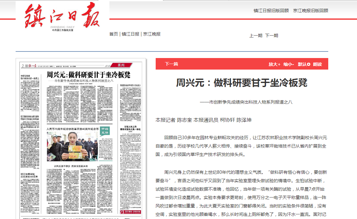 在博士刘南清看来,周兴元的研究非常接地气,具有实践应用的前瞻性。“比如目前草坪普遍不耐阴,树底下往往光秃秃,周老师的研究就紧盯怎么培育耐阴草坪。”在农博园的种植基地,周兴元蹲下来捻着脚下的草丛,与同事刘南清探讨着不同遮阴条件下的草种长势。周兴元说,他希望通过耐阴草种的培植,建立起“上看乔木、中看灌木、下看草坪”的立体化种植模式。不仅如此,考虑到江苏省滩涂资源丰富,却因为含盐量高寸草不生,他下一步准备着手耐盐型草种的培育。