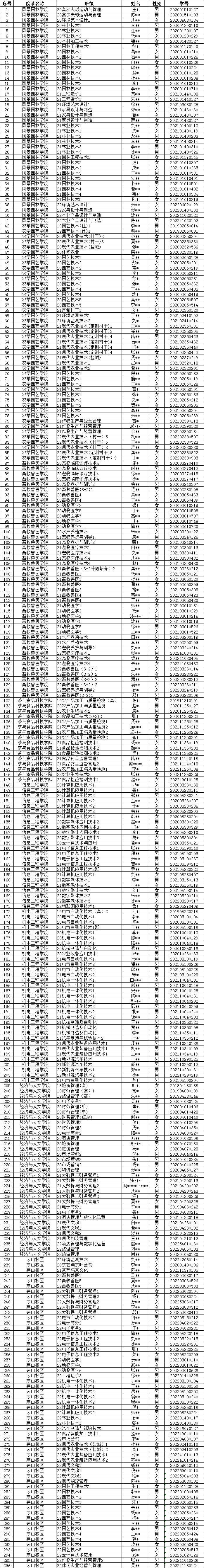 根据江苏省财政厅、江苏省教育厅、江苏省扶贫工作领导小组联合下发的《关于对建档立卡家庭经济困难学生加强教育资助工作的意见》(苏财教〔2016〕151号)等文件要求,经班主任和二级学院初审、学院审核,共有296名学生符合建档立卡免学费,现予以公示。对以下同学如有异议,请于2022年11月25日前到学生资助管理中心王庆老师或者孙颖老师处反映,反映问题的同学要实名并且提供相关证明材料,公示期结束后,不再受理相关反映。地点:综合楼207室;联系电话:0511-87290202;邮箱:jsnlzz@163.com。